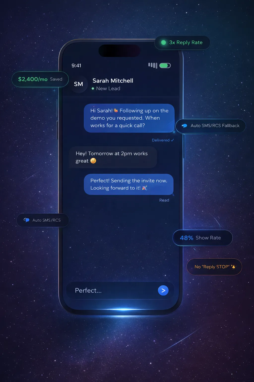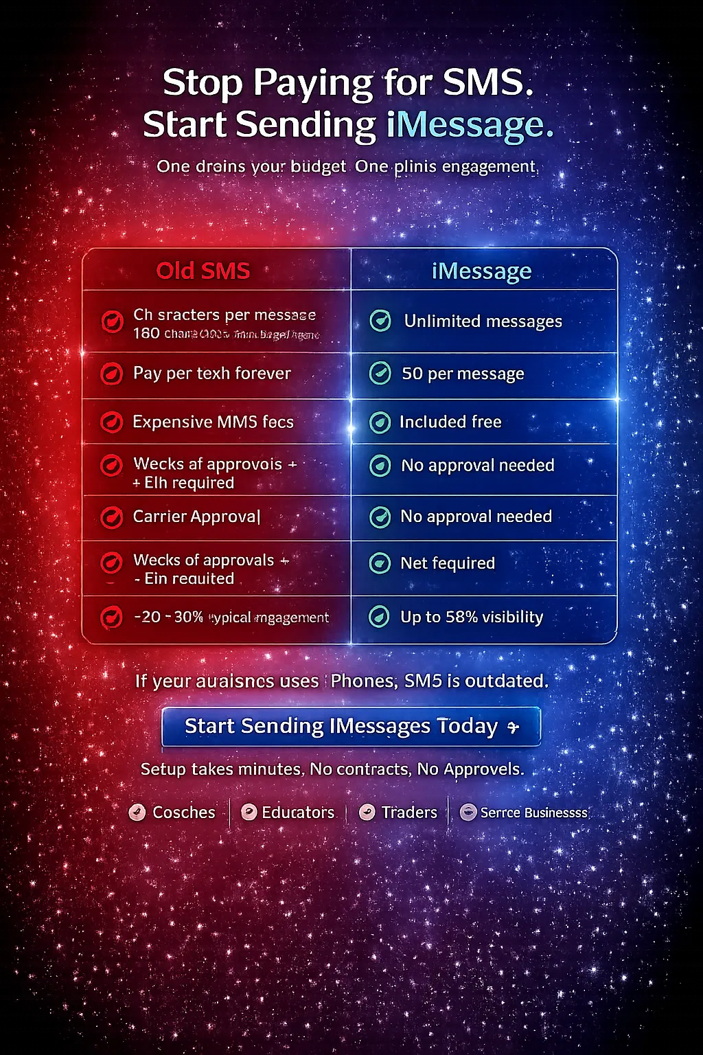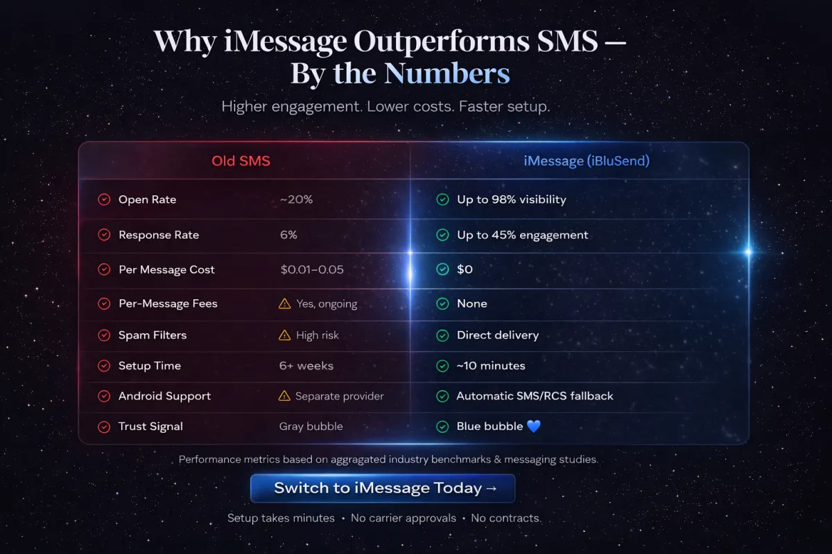 iMessage delivers your messages as a trusted blue business with 98% open rates, compared to - 20% for traditional SMS. There are no per-message fees eating into your margins, no complex registration processes, and you can start sending in minutes instead of waiting weeks for approval.