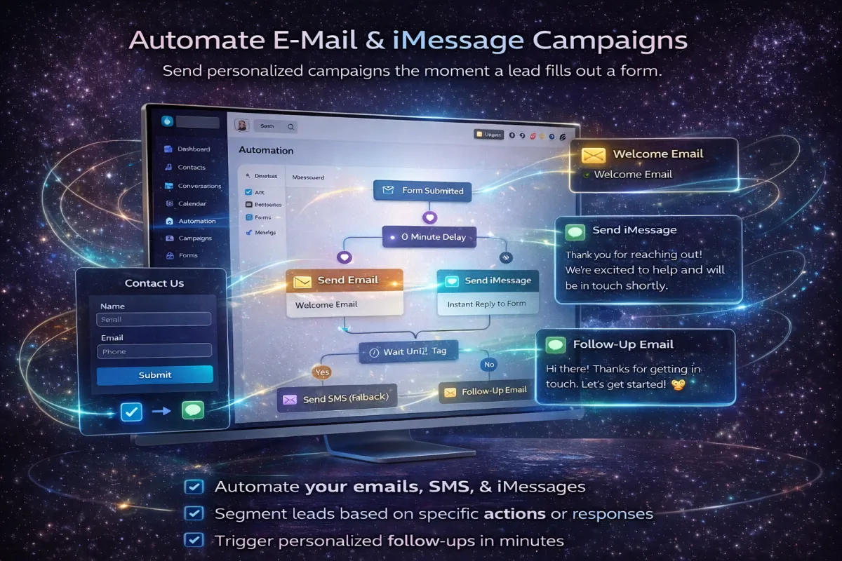 Store, organize, and manage every lead in one smart contact hub. Track conversations across email, SMS, iMessage, Facebook, and Instagram — all from a single inbox. Start real conversations using blue-bubble messaging that feels natural, personal, and trustworthy.
