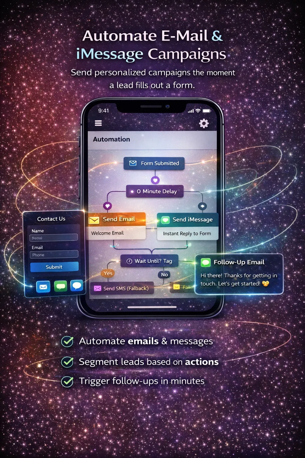 Set it once—Agency Plug automatically handles your follow-ups, appointment reminders, and lead nurturing campaigns across Email, SMS, and iMessage. From the moment a lead enters your system, intelligent workflows take over to engage, segment, and move them through your pipeline—without you having to manually send messages or track responses.