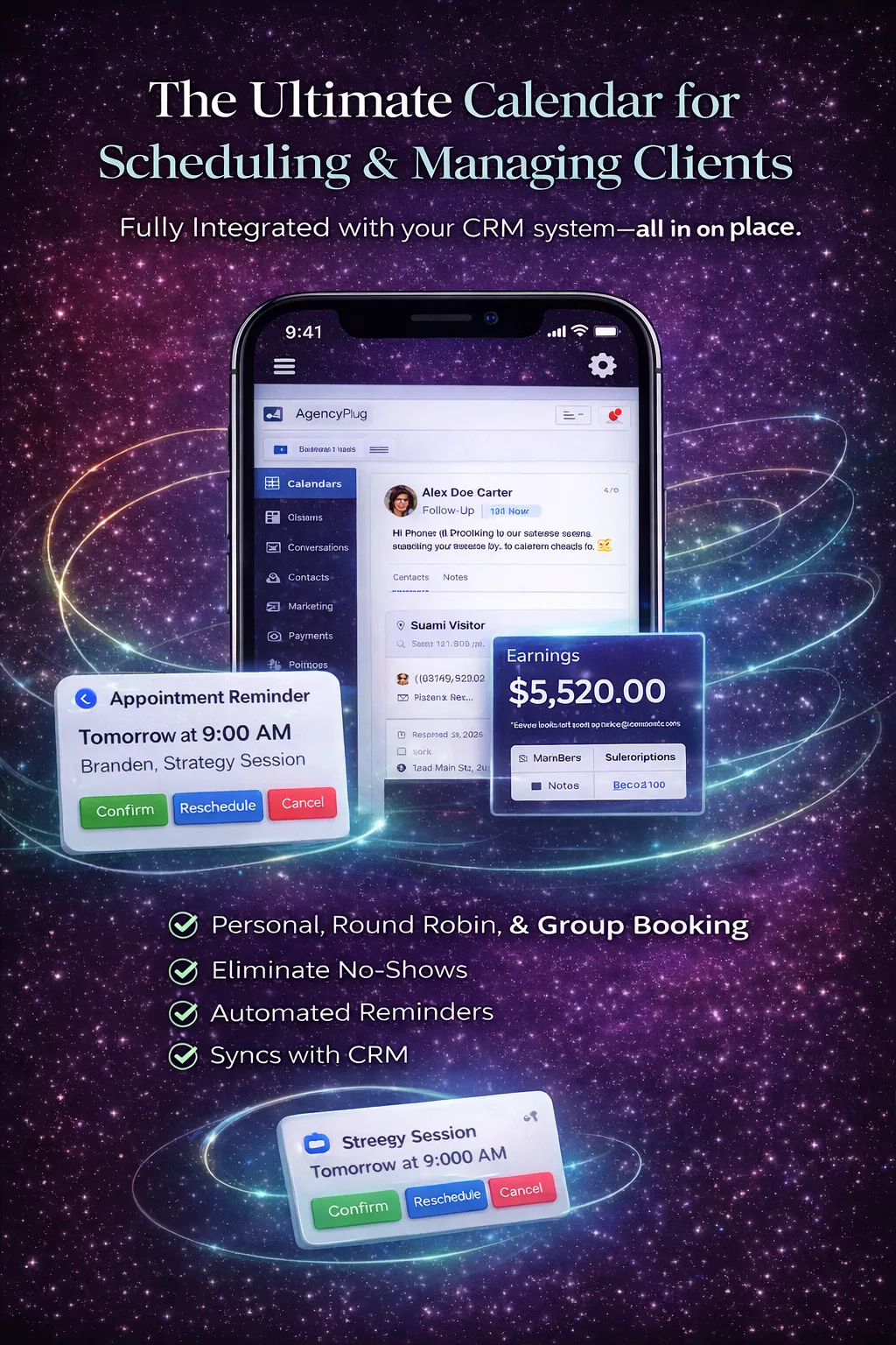 No more patching together tools that barely talk to each other. Agency Plug combines your essential business systems into one intuitive platform, so you can manage leads, build pages, automate follow-ups, collect payments, book appointments, and run webinars — all from one place.