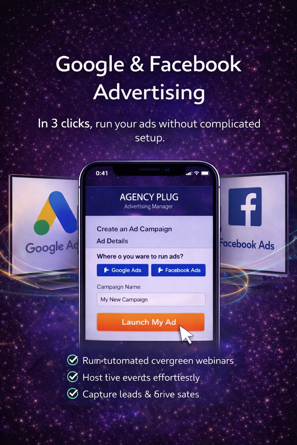 Create paid memberships, run thriving communities, book appointments, and host evergreen or live webinars—all from one powerful platform. Agency Plug gives you the tools to engage your audience, deliver value, and generate revenue without juggling multiple systems. Use our Advertising Manager to bring traffic to your business.